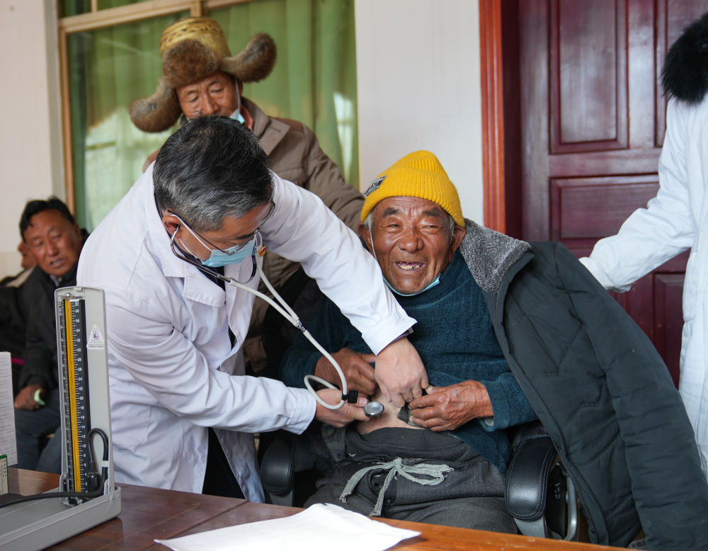 1月24日,西藏大学医学院熊海教授给患者检查身体。新华社记者 晋美多吉 摄