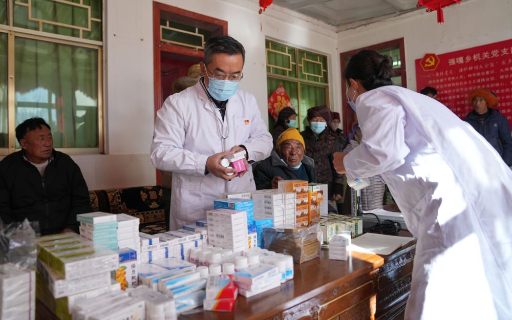 1月24日,西藏大学医学院熊海教授给患者发放药品。新华社记者 晋美多吉 摄