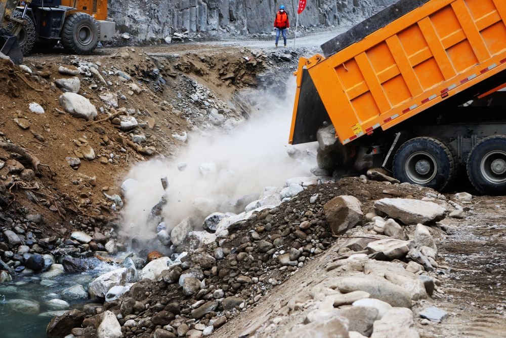 记者在截流现场看到,玉曲河两岸,多台自卸车、铲车、挖掘机在工作人员的指挥下有序地将石头、渣土等倒入截流处。不多时,湍急的河流变得平静,玉曲河成功截流。