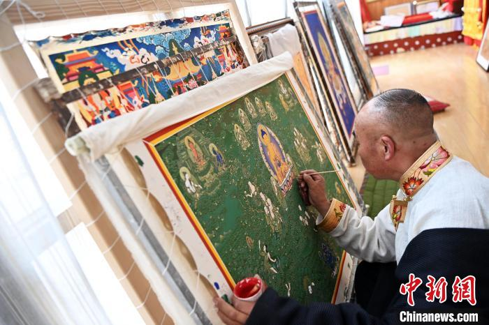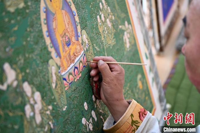 图为交巴加布在个人工作室内给唐卡上色。一幅精美的唐卡作品,需要耗费画师几个月甚至几年时间。从勾线到着色,每一步、每一笔都要屏息凝神。九美旦增 摄