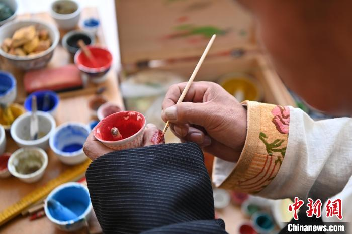 图为交巴加布在其工作室内给唐卡上色。他擅长运用细腻的笔触和丰富的色彩,将人物形象刻画得栩栩如生,生动逼真。每一幅唐卡都仿佛是一个故事,充满了生命力和情感。九美旦增 摄