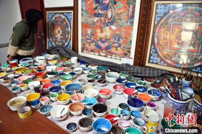 图为唐卡小镇一画室内摆出大大小小已完成的唐卡和各色颜料。唐卡具有鲜明的民族特点和独特的艺术风格,采用金、银、珍珠、玛瑙、珊瑚、松石、孔雀石、朱砂等珍贵的矿物宝石和藏红花、大黄、蓝靛等植物为颜料。九美旦增 摄