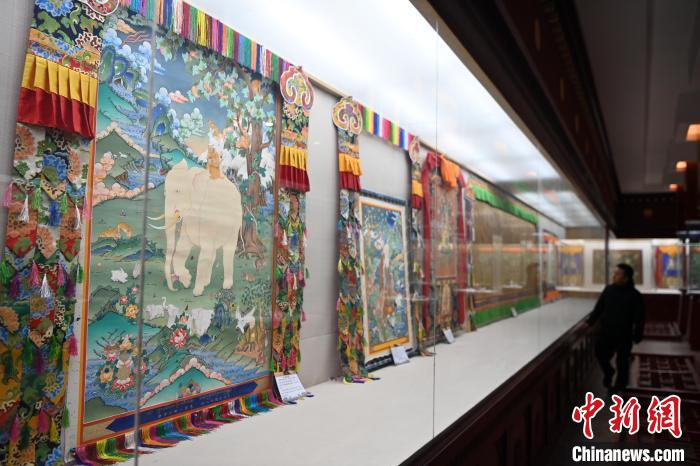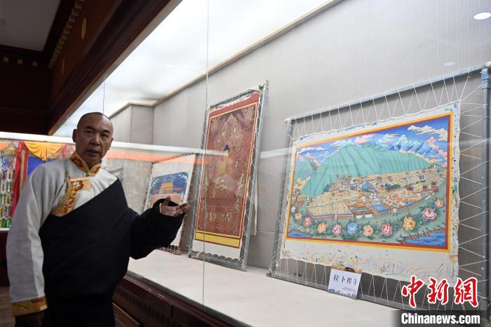 图为精品唐卡展厅内展出的交巴加布与父亲的唐卡作品,常吸引游人“打卡”。九美旦增 摄