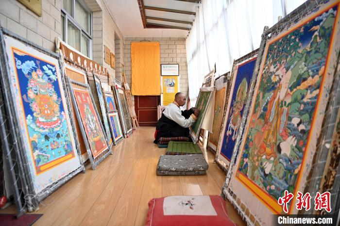 交巴加布的唐卡作品涵盖了布面彩绘唐卡、珍珠唐卡、刺绘唐卡、织锦唐卡等10余种类型。他在唐卡着色、晕染、勾线、上色等方面都有很深的造诣,使得他的作品色彩鲜艳、线条流畅、构图巧妙,充满了艺术魅力。图为交巴加布在个人工作室展示绘制的小唐卡。九美旦增 摄