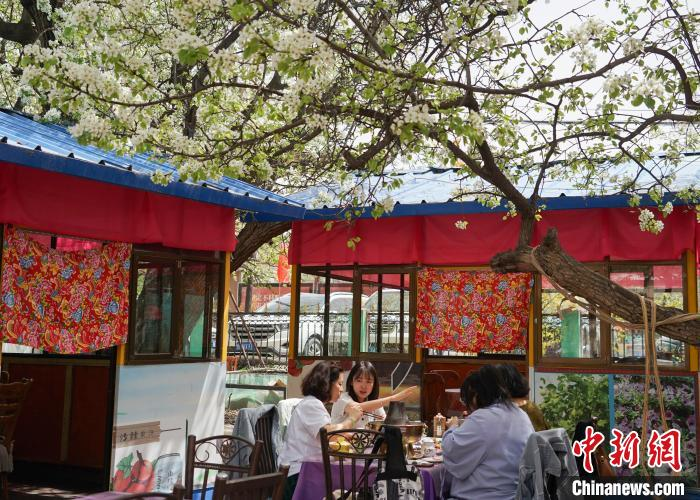 图为游客正在梨花盛开的农家乐中用餐。 马铭言摄