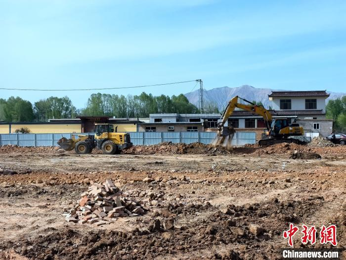 四月,在青海省海东市民和回族土族自治县中川乡金田村,民和县地震灾害避让搬迁安置项目施工现场工人忙碌、机械轰鸣。