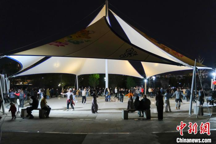 4月26日晚,在拉萨柳梧中心公园跳锅庄舞的市民,现场热闹非常。 中新社记者 江飞波 摄
