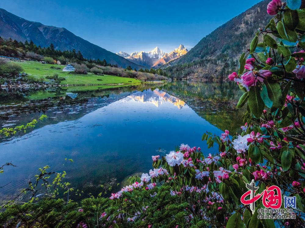 还未消融的冰雪与蓝天相接,粉色的杜鹃花依次盛开......走进被群山、森林、草原环抱的木格措,春天气息扑面而来。