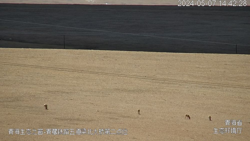 2024年5月7日14时30分许,通过“青海生态之窗”观测可可西里五道梁区域,发现藏羚羊通过青藏铁路五道梁北大桥。(卡娅梅朵摄)
