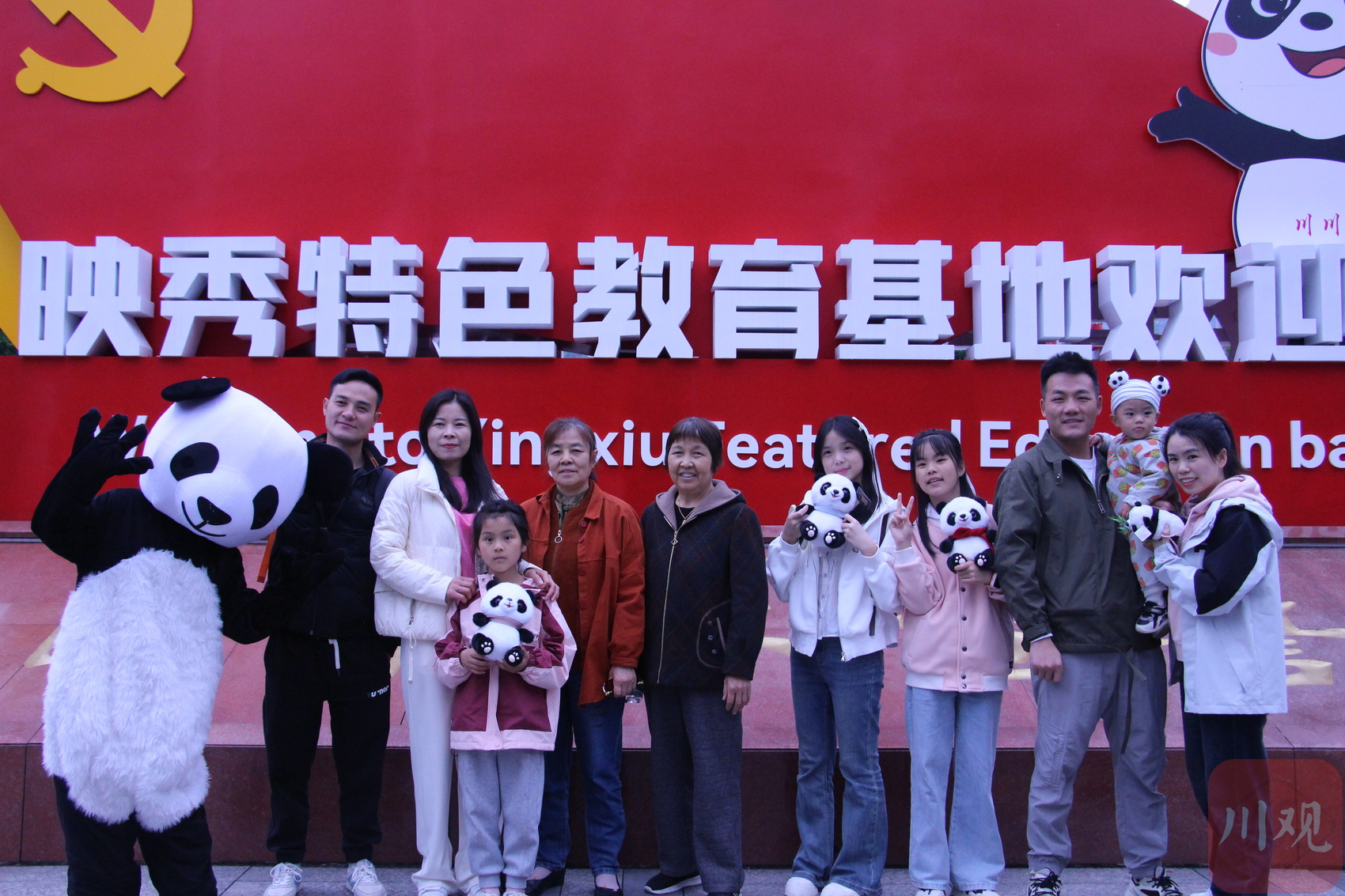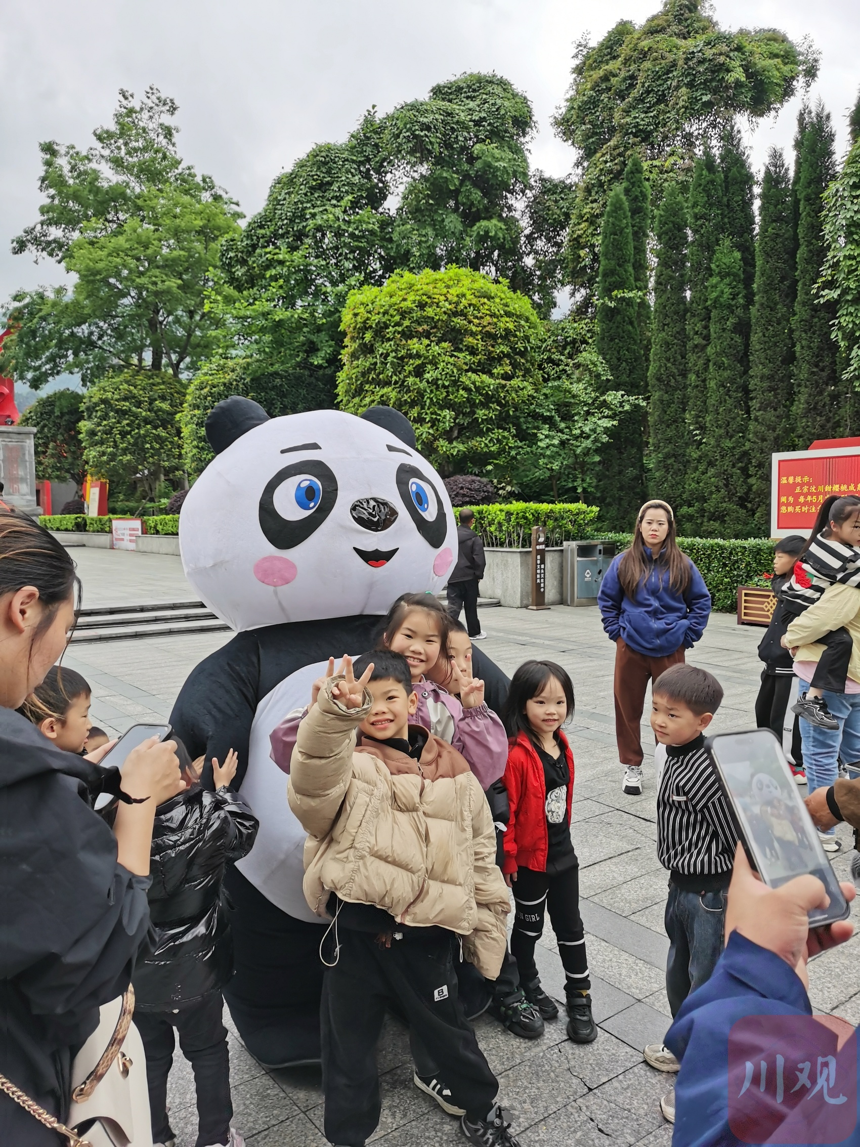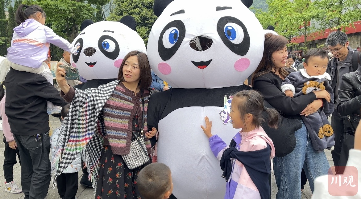 5月5日下午,在汶川县映秀镇家国情怀宣誓广场和莞香广场时不时传来孩子们的欢呼声。走近一看,原来是一个个熊猫玩偶在和他们互动玩耍,家长们在一旁举起手机拍照打卡。