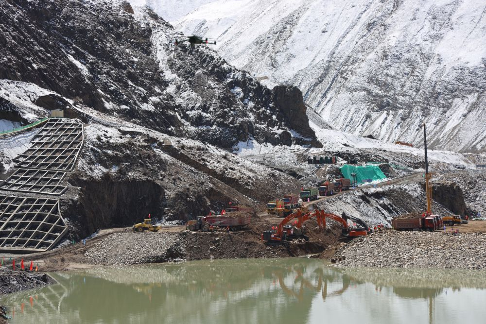 工人驾驶机械在西藏帕孜水利枢纽及配套灌区工程进行合龙截流(5月9日摄)。新华社发 王丰收 摄