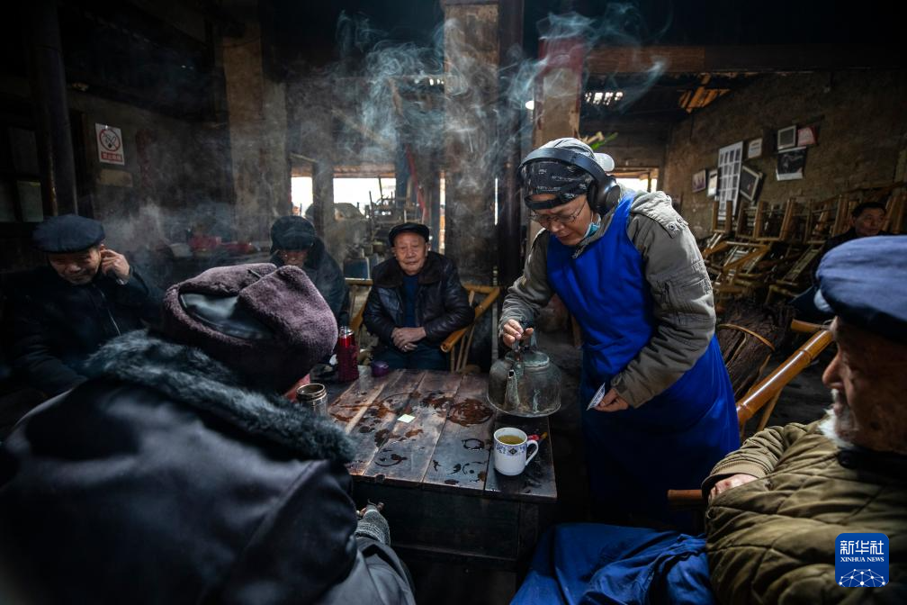 在成都市双流区彭镇观音阁老茶馆,老板李强(右二)为茶客们添水(2021年11月23日摄)。 新华社记者 沈伯韩 摄
