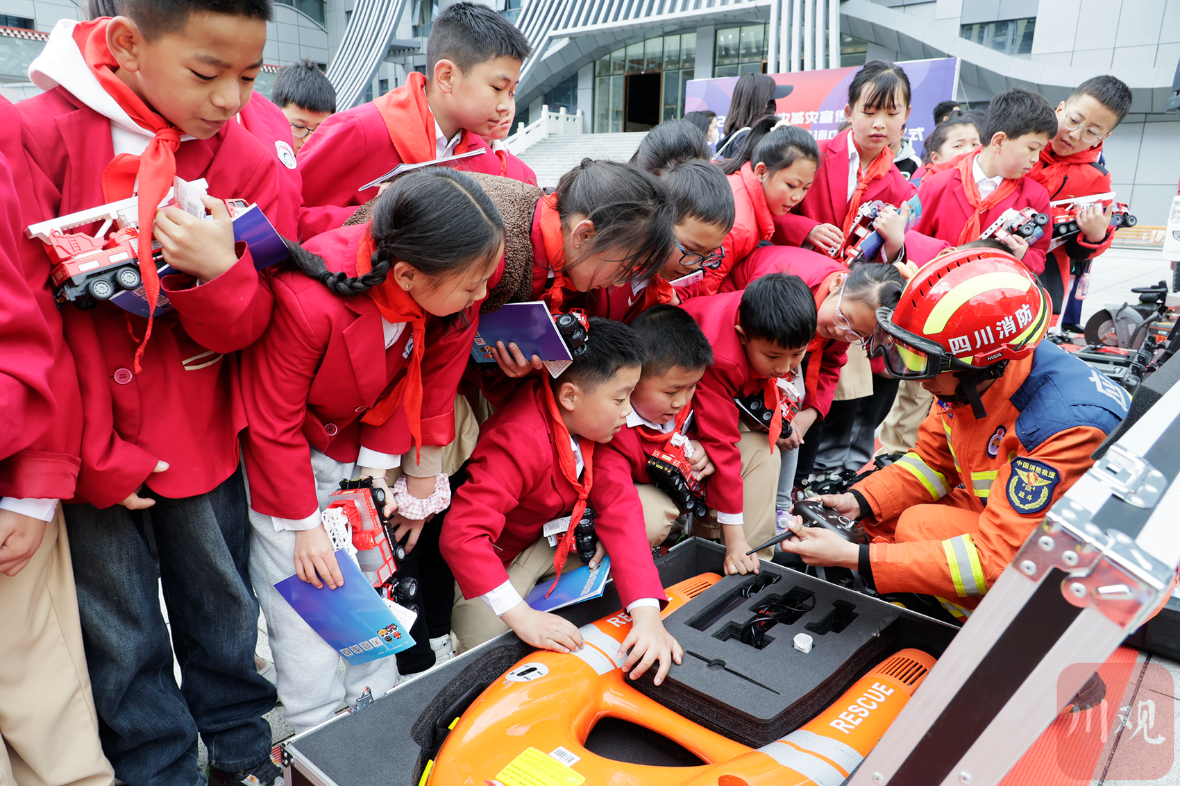 消防员正为学生了解消防知识。阿坝州消防救援支队供图