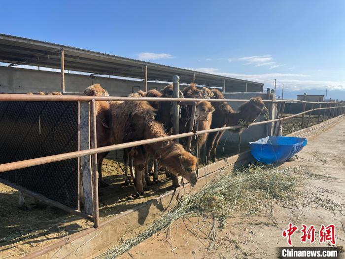 图为养殖场内骆驼正在吃草。(资料图)中新网记者 孙睿 摄