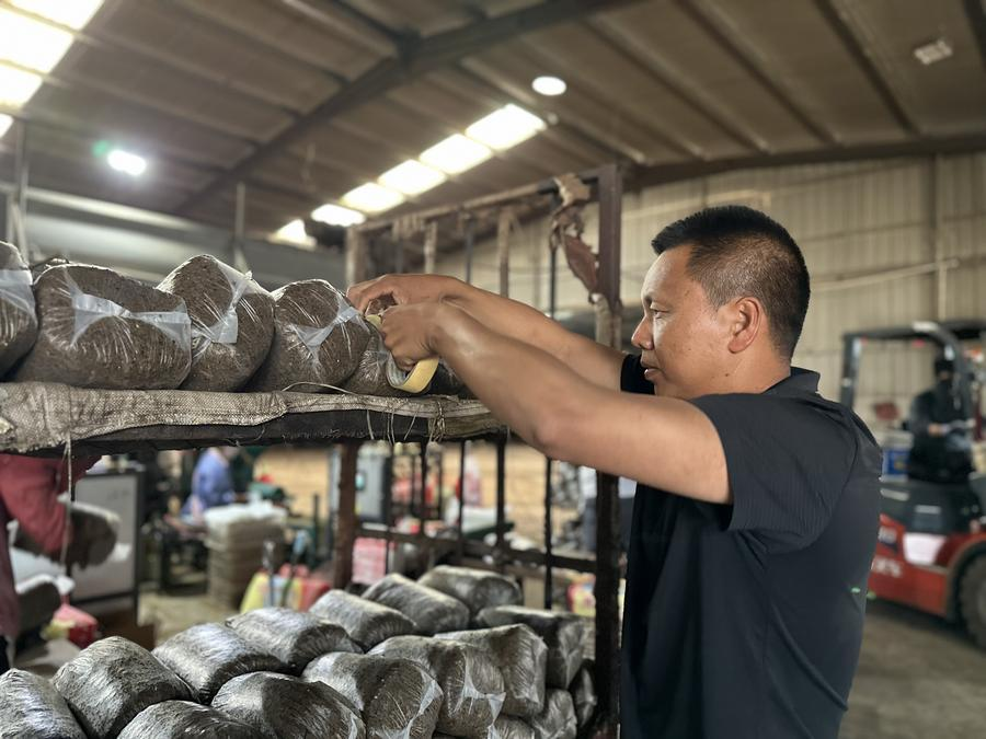 郑金云在食用菌菌棒生产车间工作(5月21日摄)。新华社记者 张文静 摄