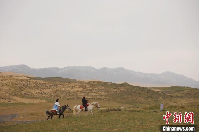图为民众在青海湖北岸的山坡上骑马。张添福 摄