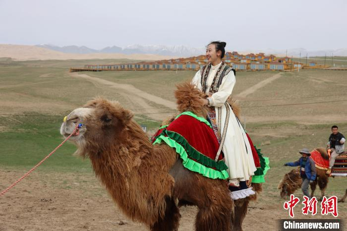 图为民众在青海湖北岸的青海海晏县金沙湾观湖露营基地骑骆驼。张添福 摄