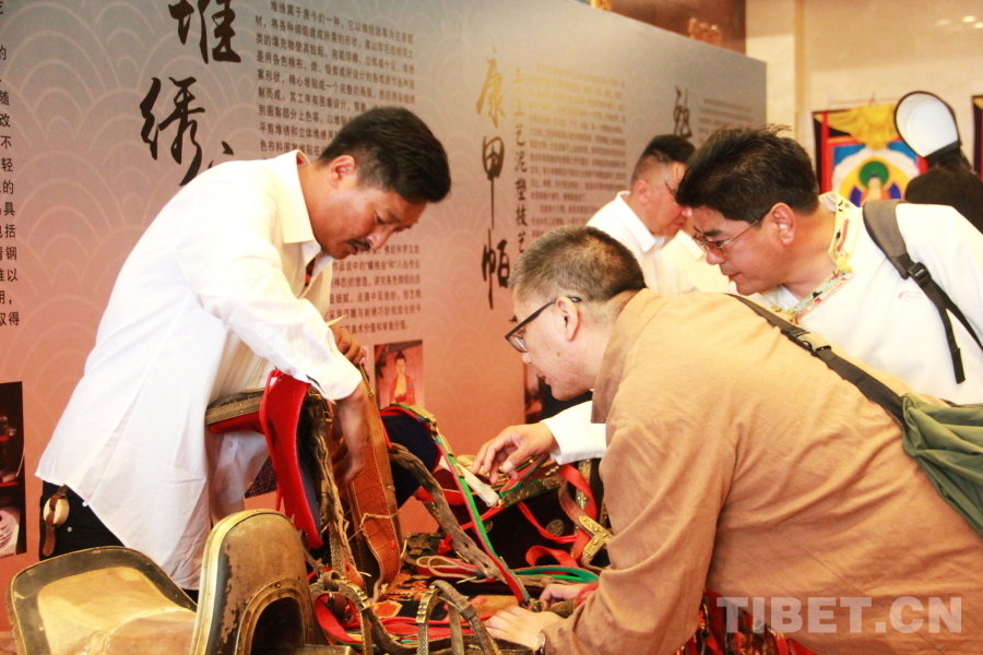 图为“花开道孚 润道有声”道孚县文化传承发展座谈会与会嘉宾在道孚县非物质文化遗产展上了解马具制作工艺 摄影:刘莉