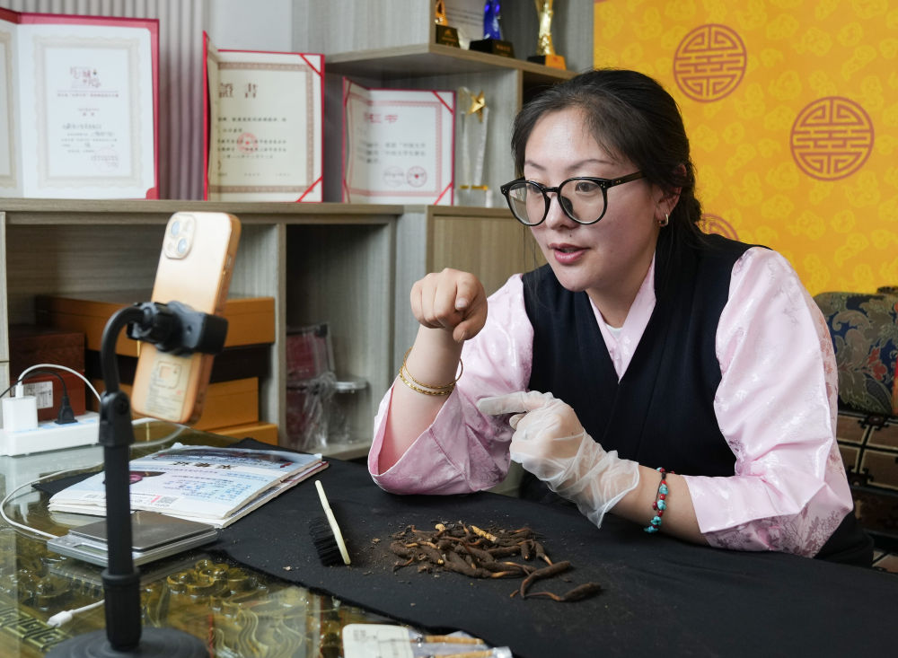 在梦誉虫草产业带直播基地,罗拉的妻子次仁白吉在直播带货(5月31日摄)。新华社记者丁汀 摄