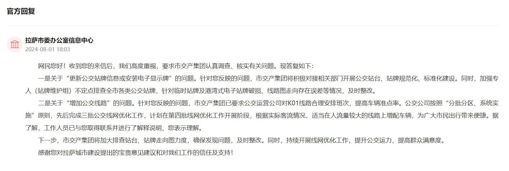 收到留言后,拉萨市委高度重视,要求市交产集团认真调查、核实有关问题,并对网友提出的建议进行了逐条回复。