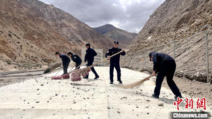 图为普兰边检民警清理落入公路上的碎石。钟悦祺 摄