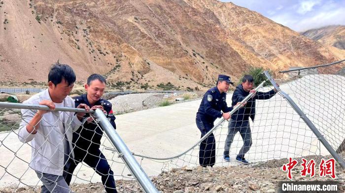 图为普兰边检民警与边民抢修道路沿线防护栏。钟悦祺 摄