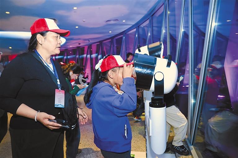 图为参加冬令营研学交流活动的波密少先队员在广州塔用共享望远镜眺望广州城市夜景。记者 谢筱纯 摄