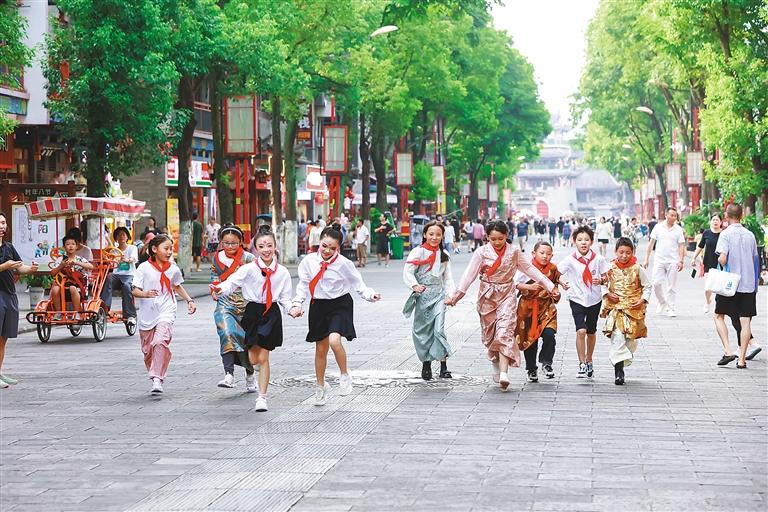 图为藏渝两地学生手牵手奔跑在山城街头。 通讯员 拥金卓嘎 摄