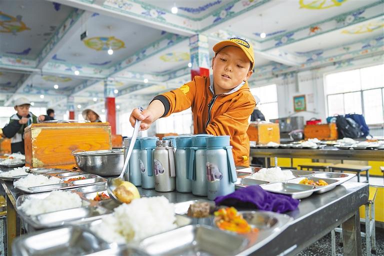 图为那曲市班戈县中石化小学学生在为同学们分发午餐(6月22日摄)。 新华社记者 丁增尼达 摄