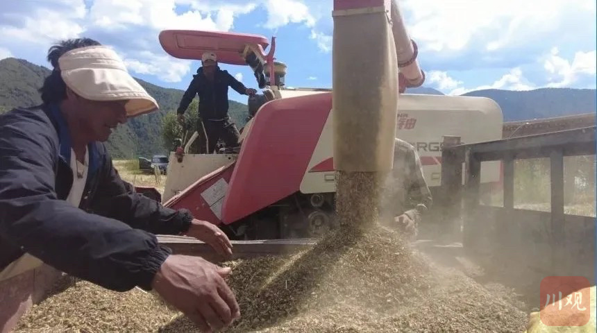 白玉县赠科乡副乡长魏成枫介绍:“基地采用了‘支部引领+集体经济代管+群众参与’的经营模式,今年每亩产量预计在400斤左右,在接下来的一周之内,将完成全部的收割工作。”