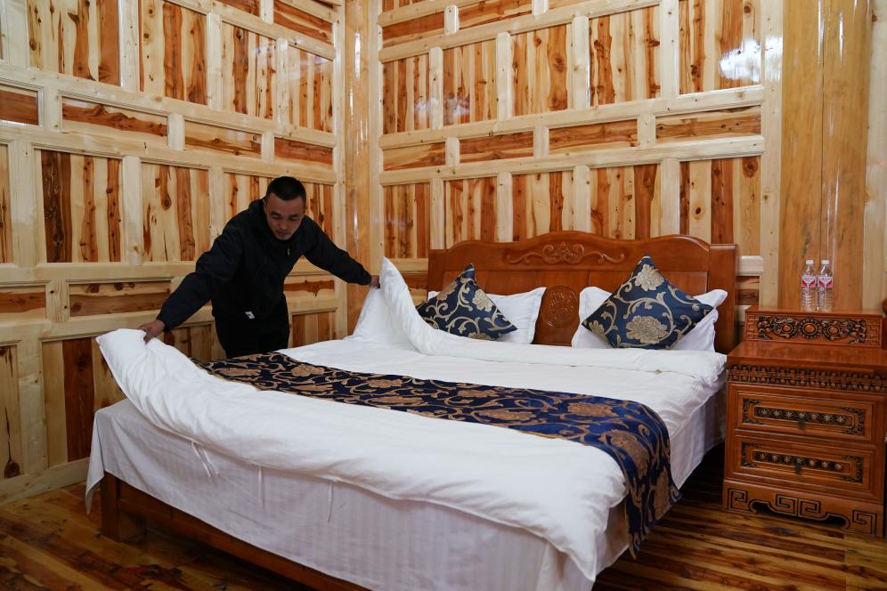 9月2日,在俄合拉村佐央之家民宿中,工作人员忙着整理床铺。新华社记者 胥冰洁 摄