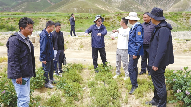 南木林县数字农业产业园内,山东省第八批援藏干部调研“艾玛”土豆种薯扩繁发展情况。