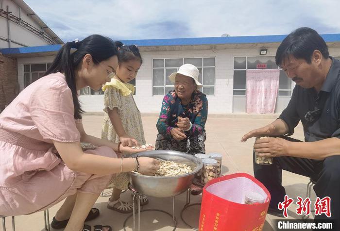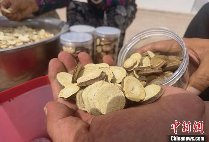 图为红溪村村民展示收获的甘草,甘草种植也成为当地支柱产业之一。刘玉桃 摄