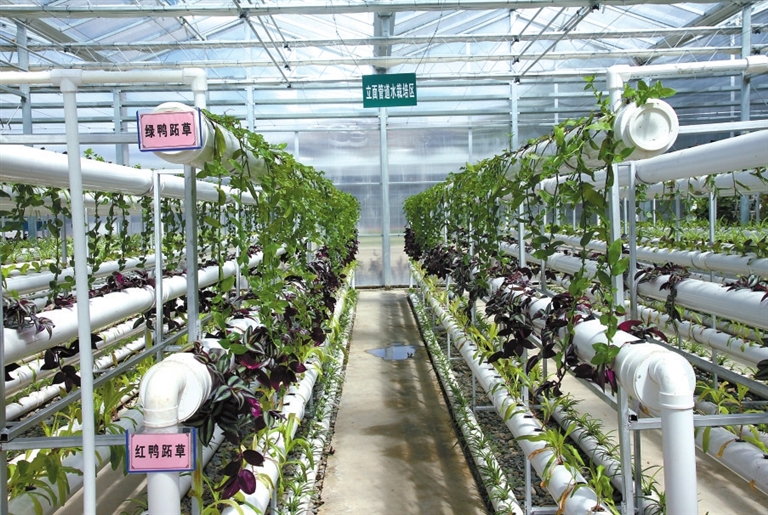 上海援建的江孜县红河谷农业科技示范园区内的立面管道水栽培区。