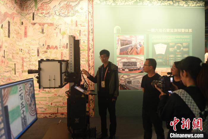 9月21日,在甘肃省敦煌市第七届丝绸之路(敦煌)国际文化博览会展馆内,游客参观敦煌研究院“典范”“高地” 建设成果展中的第四代壁画高保真自动拍摄装置。中新社记者 李亚龙 摄