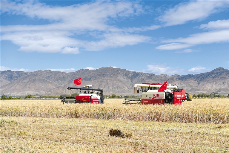 配图:日喀则市白朗县巴扎乡农机合作社的村民进行机械化收割。(资料图片)记者 李洲 摄
