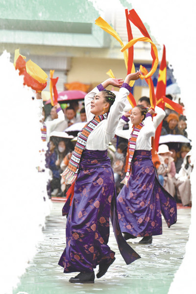 春节假期,每到傍晚时分,四川省阿坝藏族羌族自治州若尔盖县城中心的北上广场都会准时响起欢快的锅庄曲,远道而来的游客与当地群众一起跳起欢快的锅庄。伴着音乐,鲜艳的长袖在风中划出道道弧线,腰饰随着舞步摇曳,男女老少围成一圈、翩然起舞。