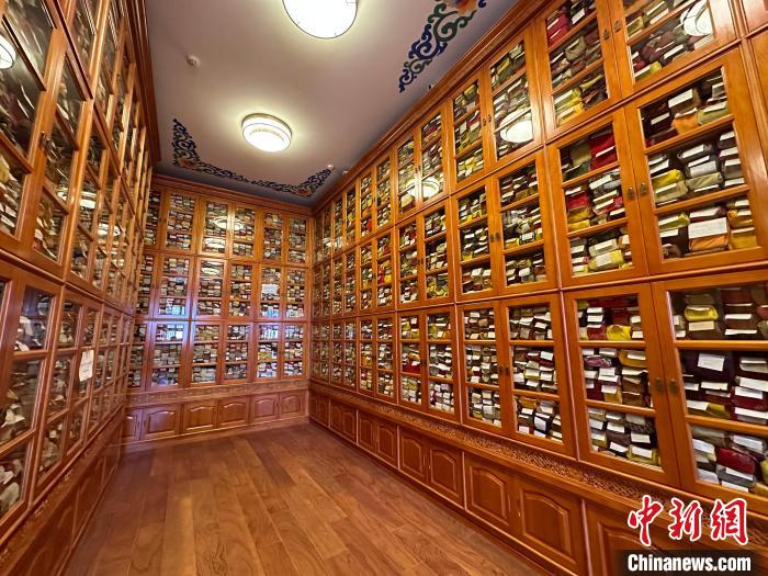 2月28日,修缮后的拉卜楞寺藏经楼内,所藏古籍文献整齐摆放于新书架上。中新社记者 丁思 摄