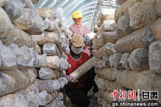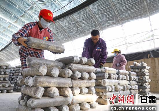 近日,走进位于民乐工业园区的甘肃鸿飞生物开发有限责任公司食用菌种植大棚,一排排菌棒码放整齐,工人们正忙着给菌棒翻垛、透气。