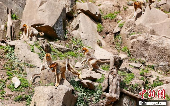 在大熊猫国家公园甘肃片区裕河园区内,川金丝猴自由觅食、玩耍,萌态十足。高展 摄