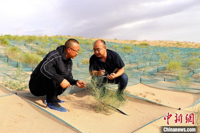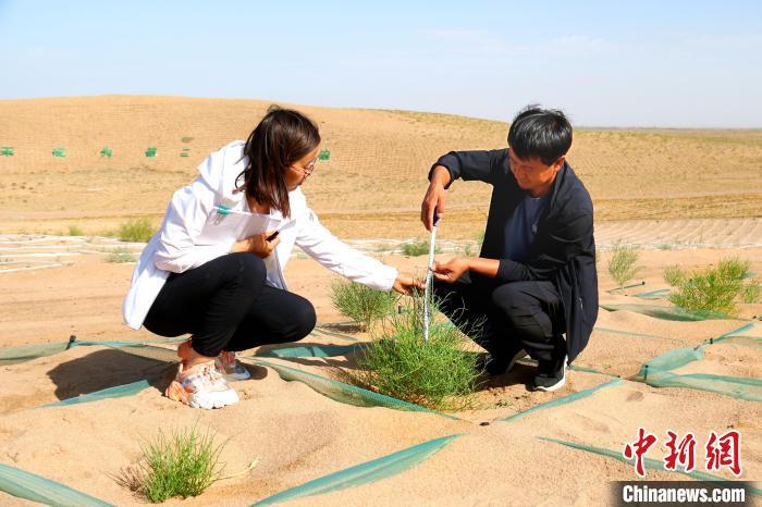 民勤县林业技术人员科学评估“雨养+节水”模式下植被恢复成效。(资料图)马爱彬 摄