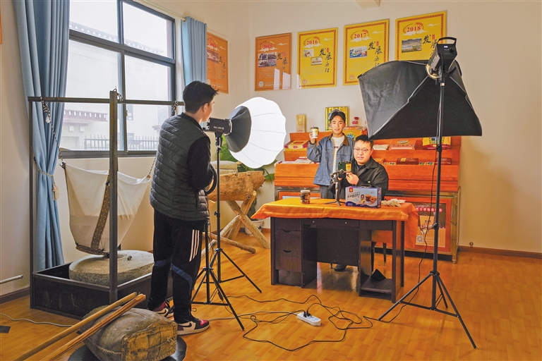 图为洛隆县洛宗特色产品开发公司的工作人员正在直播销售青稞挂面及青稞饼干。记者 丹增群培 摄