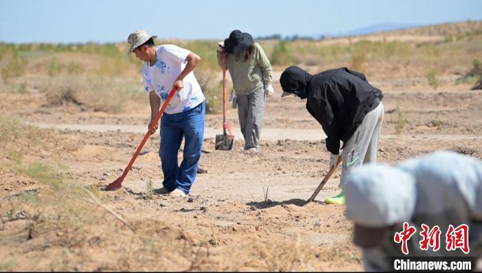 图为5月底,马俊河(左)指导志愿者在民勤治理沙漠。李亚龙 摄