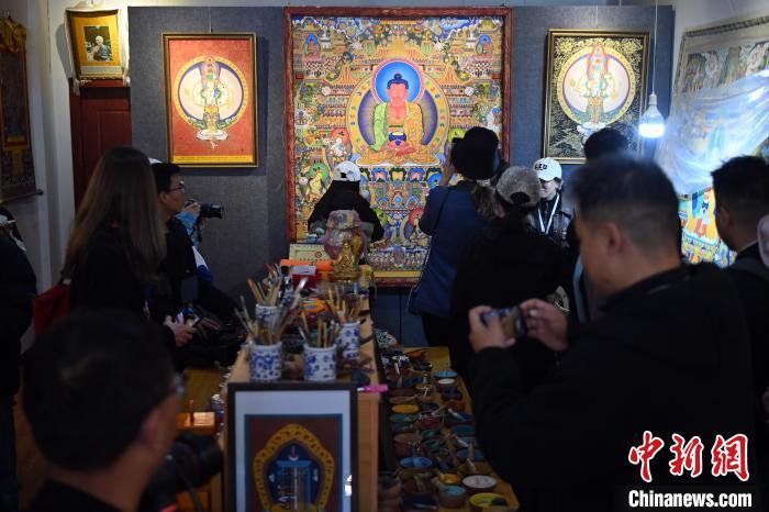 6月10日,来自美国、加拿大、瑞士、韩国等国家和地区的中外记者、网络达人走进唐卡小镇中的一家画室观摩采访。九美旦增 摄