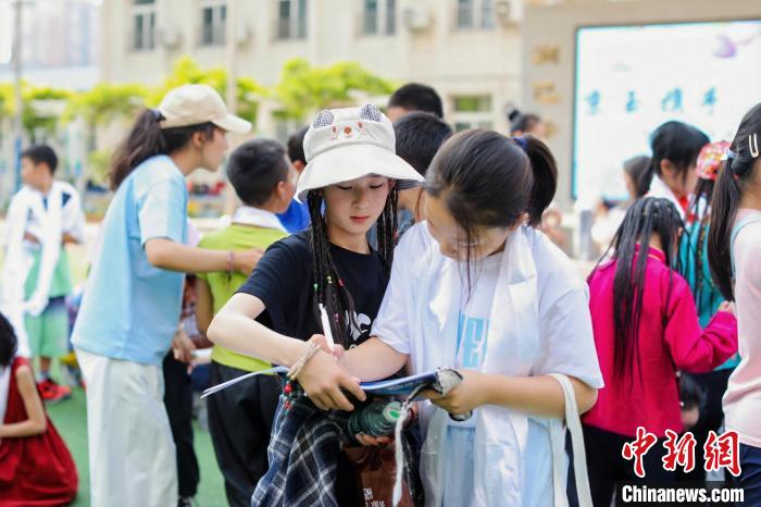 白玛措毛(前排左)和方庄二小的同学互相赠言。活动主办方 供图