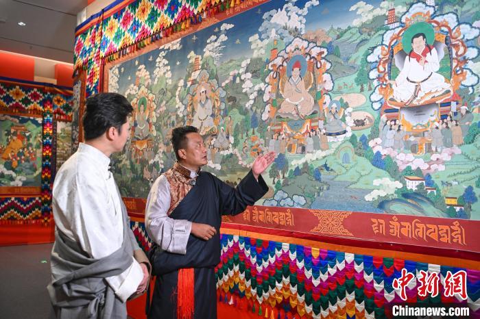 图为孜东唐卡画师介绍唐卡《吐蕃赞普世系大唐卡金子明镜》。贡嘎来松 摄