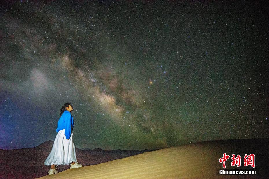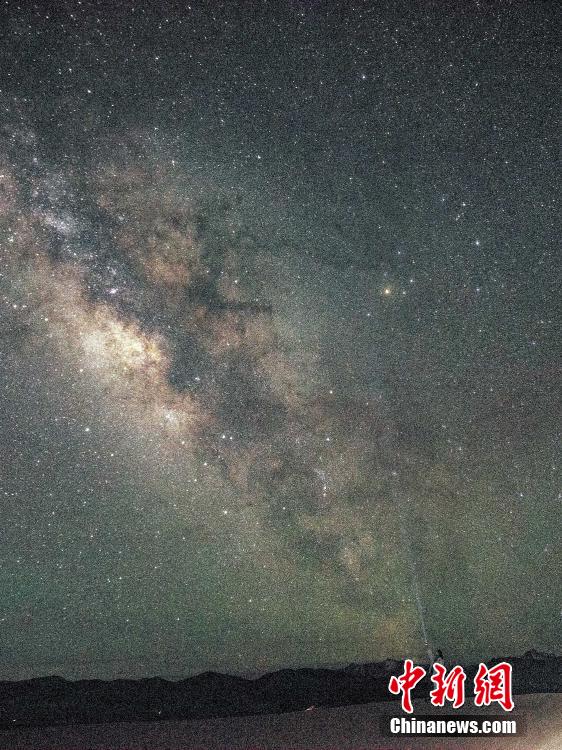 西藏阿里暗夜公园位于西藏自治区阿里地区,海拔4200米,占地2500平方公里。这里集天文观测、星空体验与旅游服务于一体。近日,随着当地进入观星季,摄影爱好者在这里拍摄捕捉到了壮丽的银河景观。图为6月20日晚游客在西藏阿里暗夜公园,与银河“合影”。曹枝清 摄