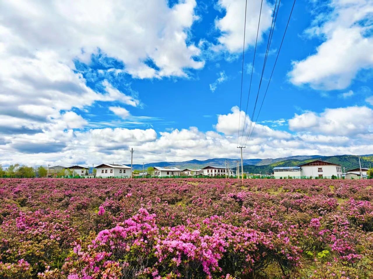 沿着国道214线来到香格里拉市小中甸镇,就能看到大片的花海。映衬着远处的山峰和蓝天白云,令人沉醉。路边停着很多旅游车,游客们都在忙着拍照打卡。