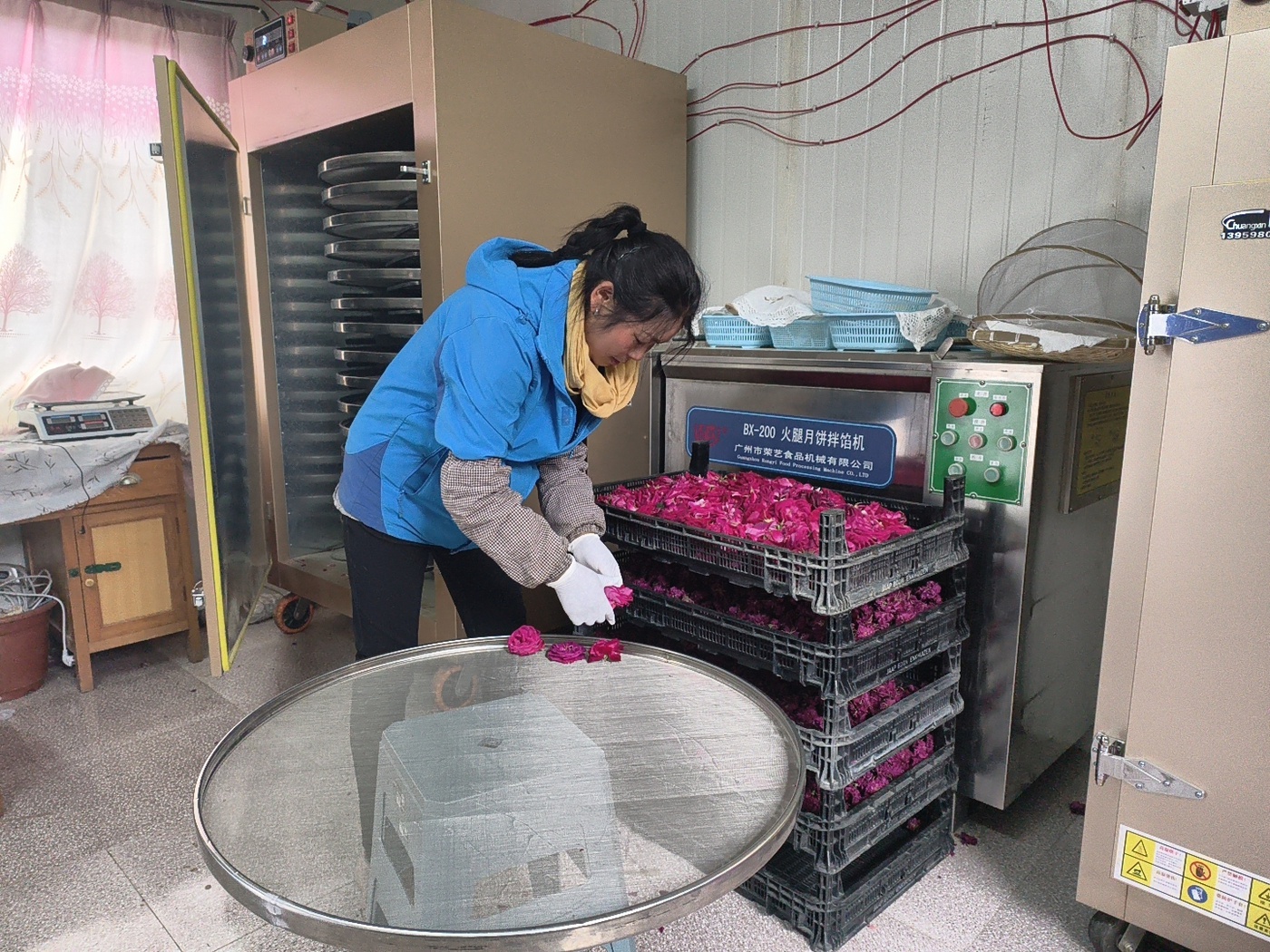 “除了观赏、卖新鲜花瓣外,我们还将玫瑰花加工成各式各样的产品。”在该公司的车间内,工作人员和金梅正忙着把采摘下来的玫瑰花筛选出来,送到烤箱中进行烘烤,最终制作出玫瑰花茶。她介绍说,“这款玫瑰花茶花香味十足,在市面上很受欢迎。我们还做出了玫瑰花露等多种产品。像玫瑰花露,有美白、保湿,缓解疲劳等功效,去年销售额达到50多万元。”