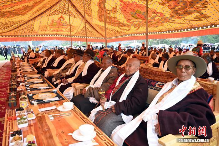 7月20日,第四届卓尼县风情旅游艺术节暨百名长寿老人共品“三宴”活动在甘肃省甘南藏族自治州卓尼县刀告乡当尕滩开幕。图为近百名百岁老人共品藏王盛宴,共庆寿辰。 九美旦增 摄